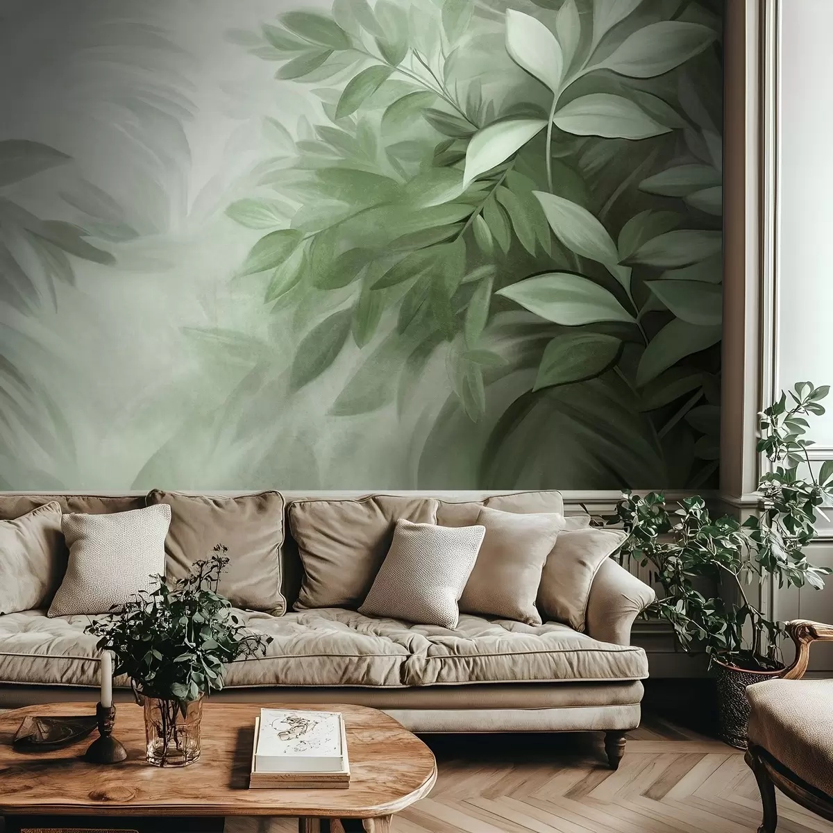 Papel tapiz Hojas verdes y grises con un follaje de textura suave y difuminada, en un estilo pictórico con pinceladas visibles Nr. w09584v1