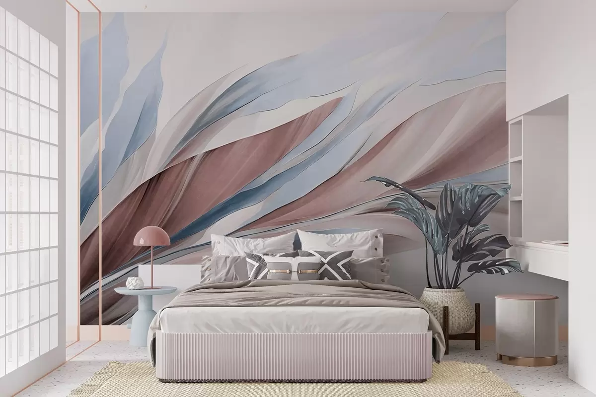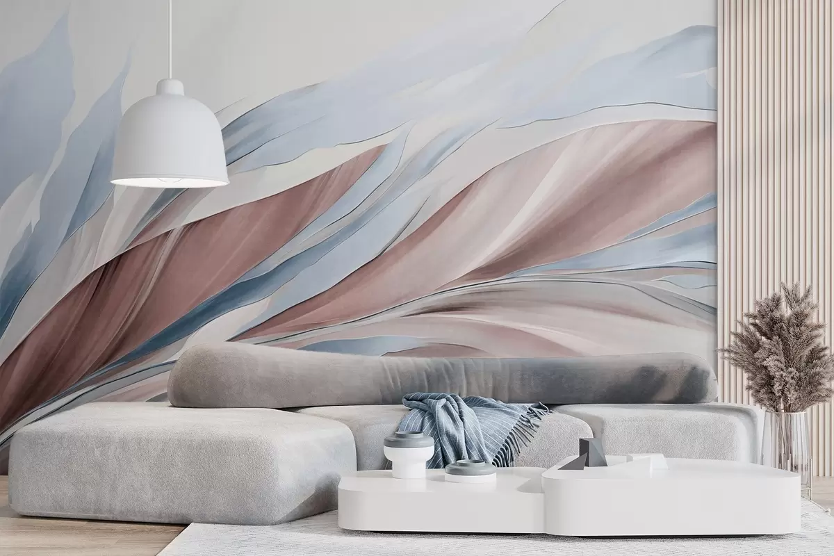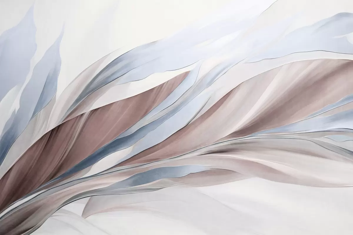 Papel tapiz Ondas abstractas fluidas de color azul y marrón, con formas y líneas finas, sobre un fondo blanco, arte texturizado. Nr. w09585v1
