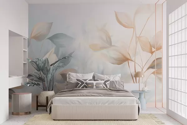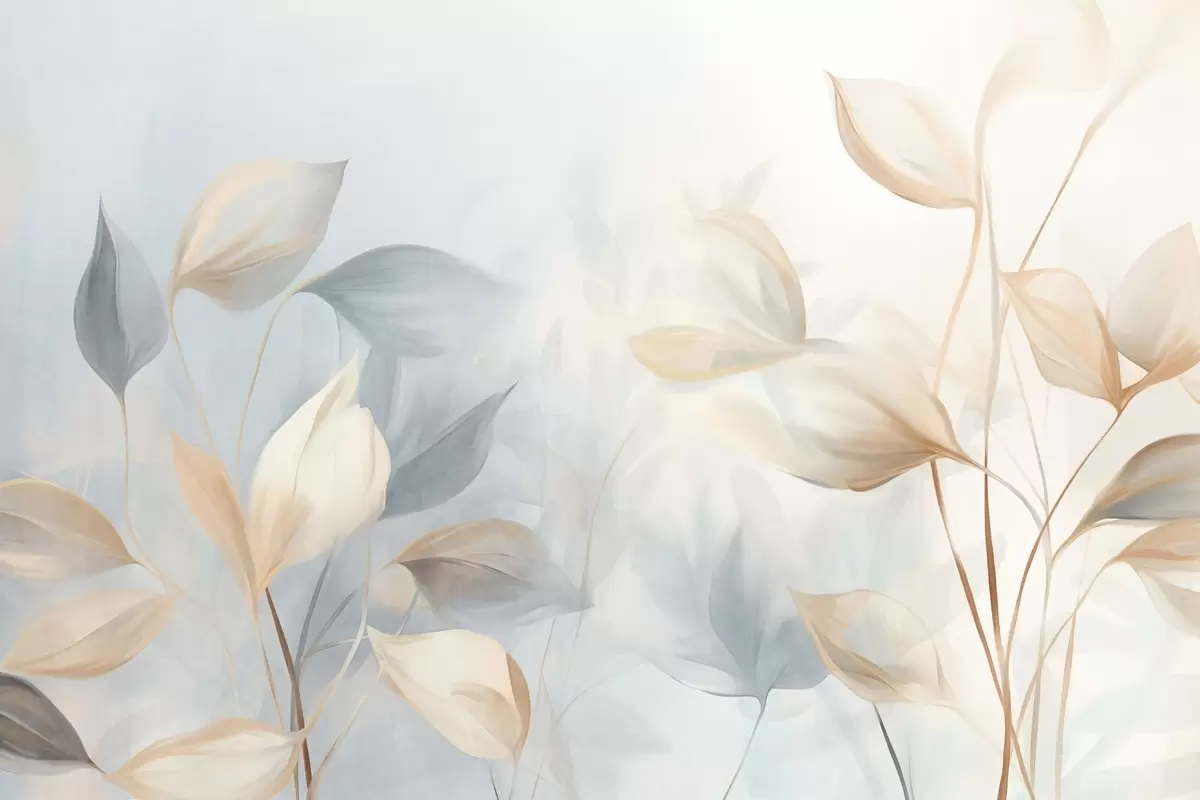 Papel tapiz Hojas suaves, delicadas y translúcidas en tonos apagados de beige, melocotón y azul pálido, arte texturizado en tonos pastel. Nr. w09607