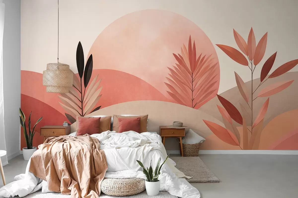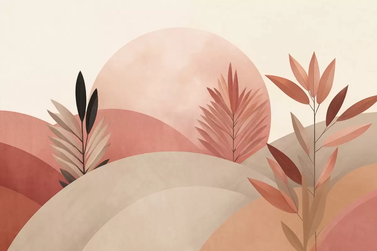 Papel tapiz Paisaje boho abstracto, sol detrás de colinas onduladas, plantas en primer plano, minimalista, texturizado, colores apagados. Nr. w09608