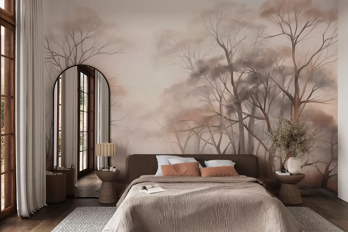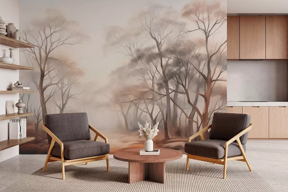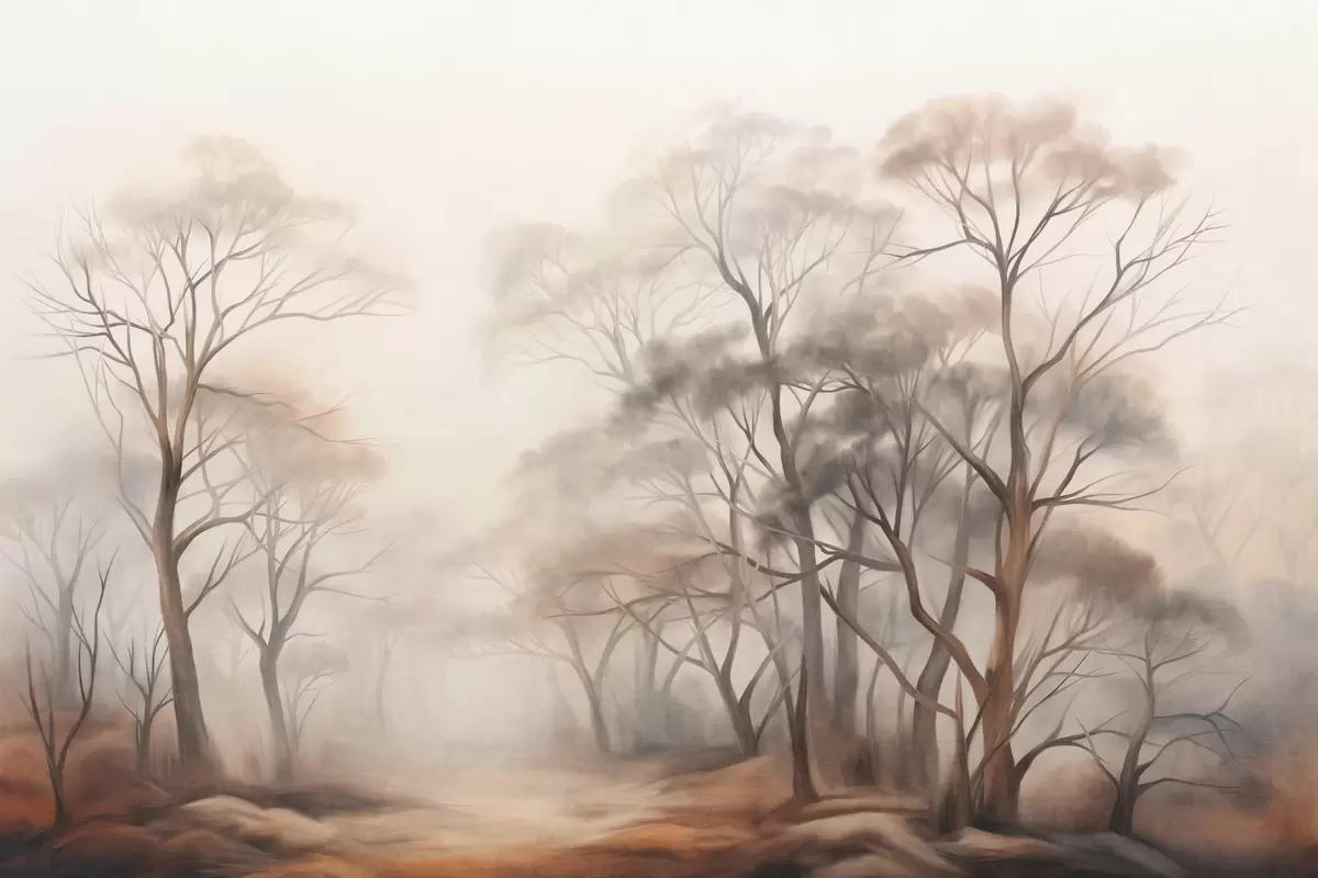 Papel tapiz Árboles con textura en un bosque brumoso, paisaje neblinoso con colores apagados y suave iluminación. Nr. w09609