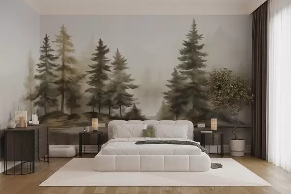 Papel tapiz Un bosque brumoso con textura y altos pinos pintados de imitación. Nr. w09610