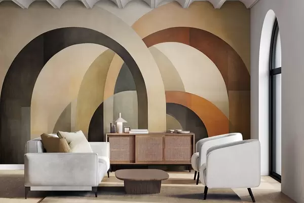 Papel tapiz Arcos geométricos abstractos con textura en tonos tierra de beige, marrón y gris, un diseño arquitectónico moderno en capas. Nr. w09611
