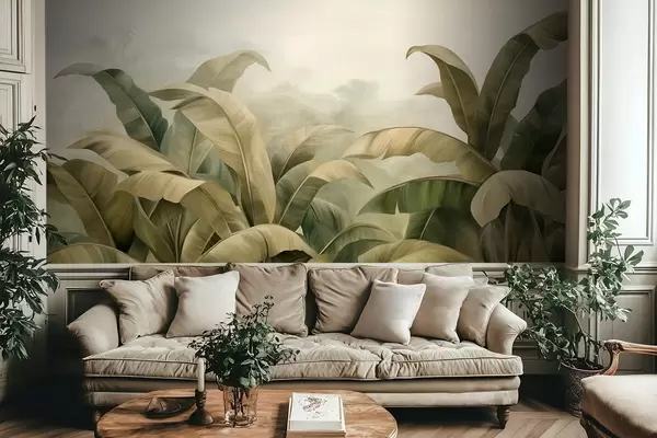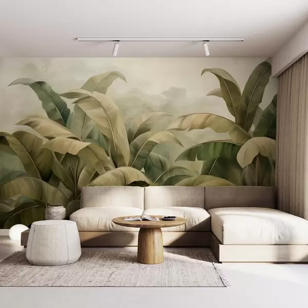 Papel tapiz Paisaje selvático denso y texturizado con grandes hojas de plátano en tonos verdes y beige apagados. Nr. w09613