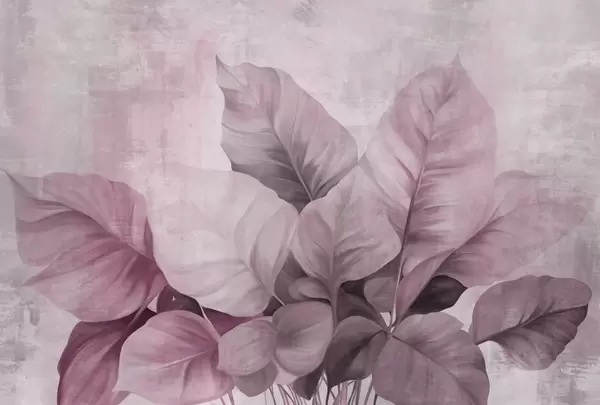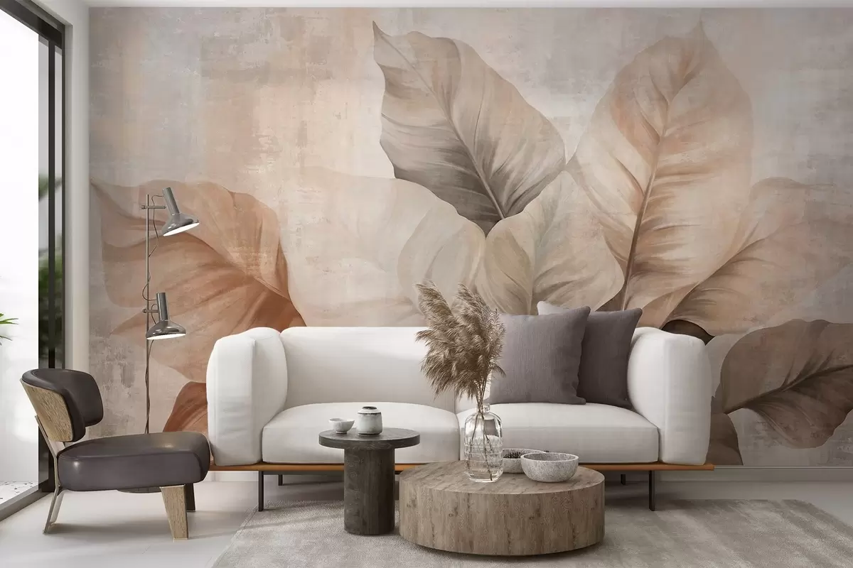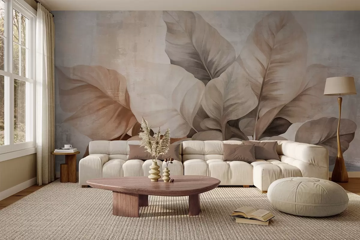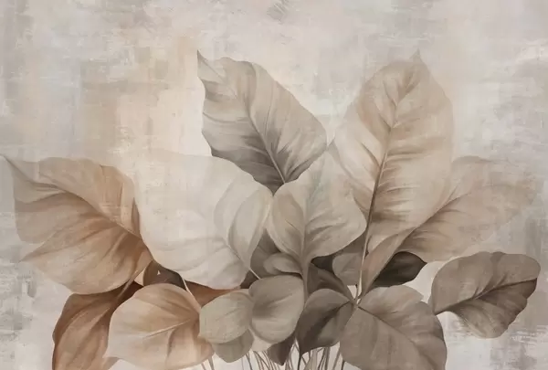 Papel tapiz Imitacione de pintura texturizada de hojas grandes de color marrón claro sobre un fondo neutro con pinceladas sutiles. Nr. w09614