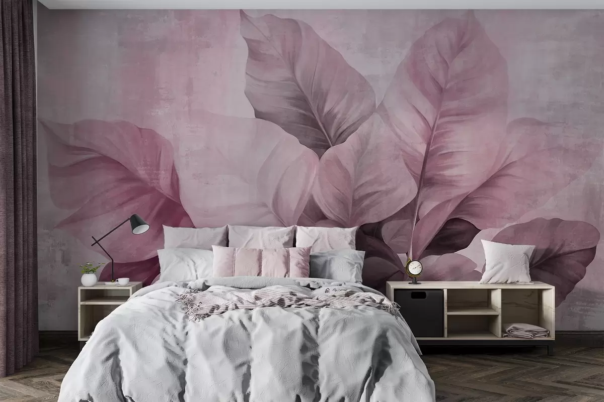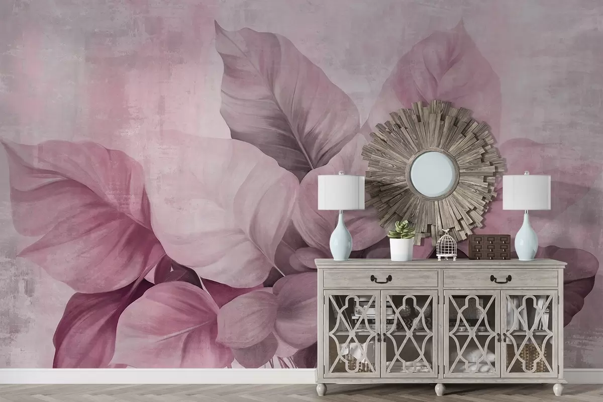 Papel tapiz Imitacione de pintura texturizada de hojas grandes de color rosa claro sobre un fondo neutro con pinceladas sutiles. Nr. w09614v1