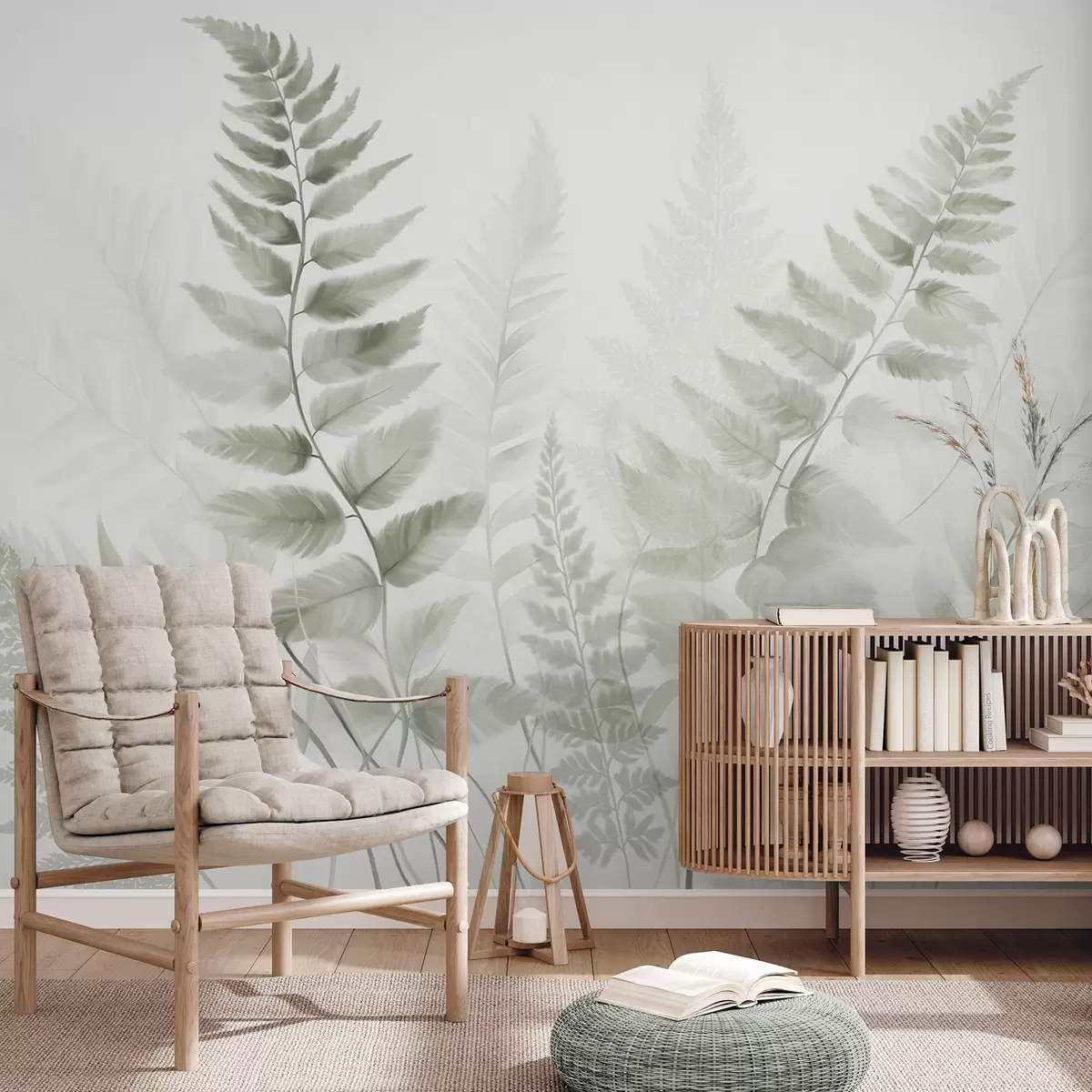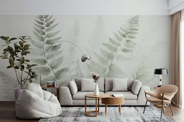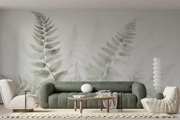 Papel tapiz Hojas secas de helecho con textura en varios tonos de verde, con un fondo suave y claro en estilo acuarela. Nr. w09615v1