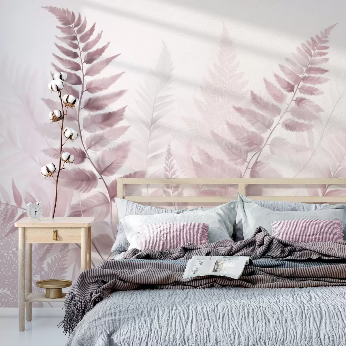 Papel tapiz Hojas secas de helecho con textura en varios tonos de rosa, con un fondo suave y claro en estilo acuarela. Nr. w09615v2