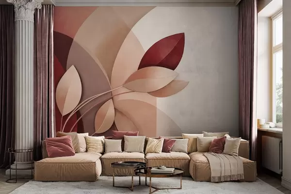 Papel tapiz Rama abstracta con textura y hojas en tonos marrones, beige y rojos, sobre un fondo de formas abstractas. Nr. w09618