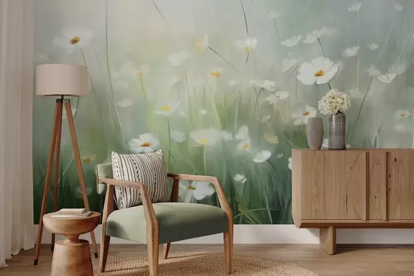 Papel tapiz Campo abstracto de margaritas blancas con hierba verde y un fondo suave y difuso en estilo pictórico. Nr. w09619