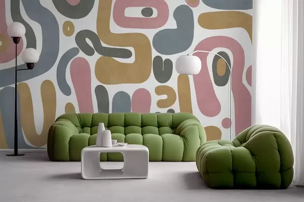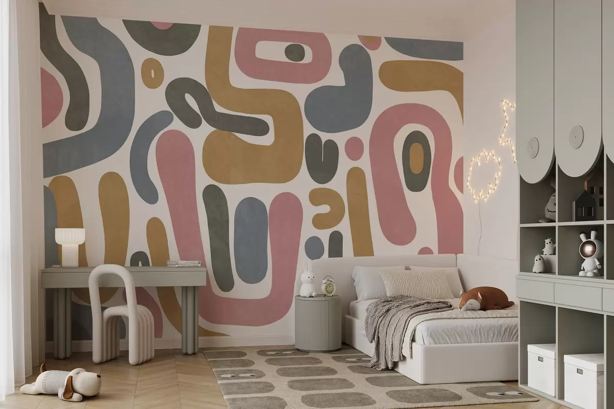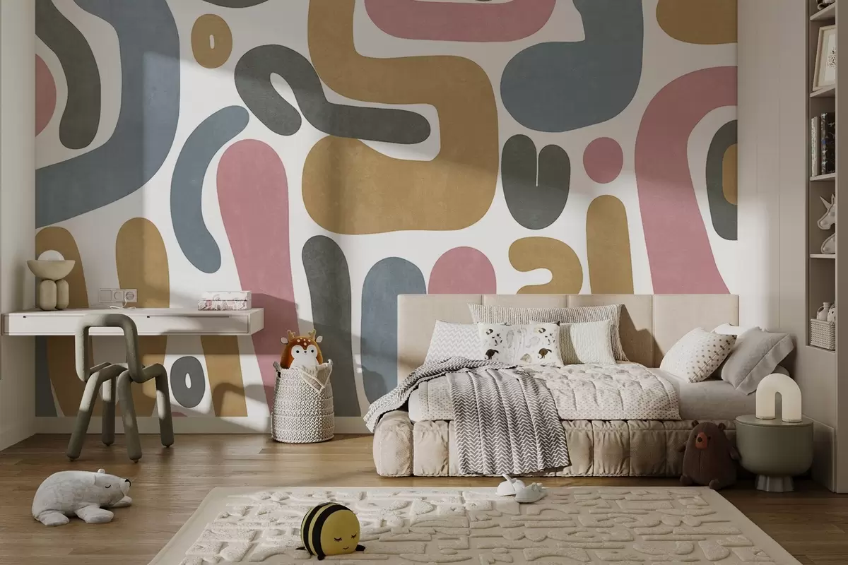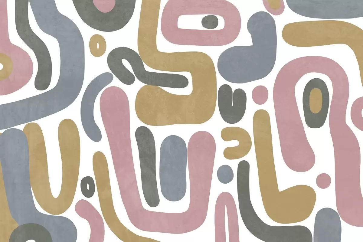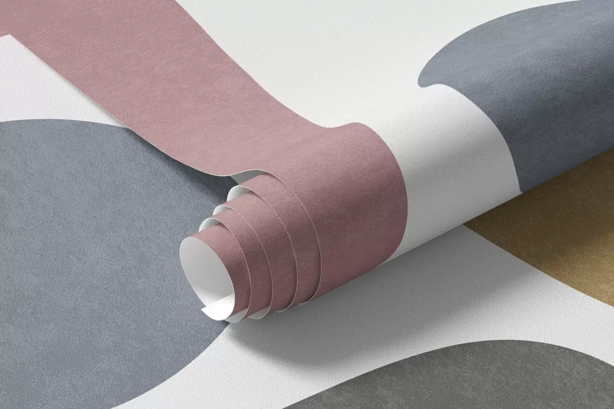 Papel tapiz Formas abstractas con textura en rosa pastel, azul apagado, amarillo mostaza y gris sobre fondo blanco, arte moderno. Nr. w09620
