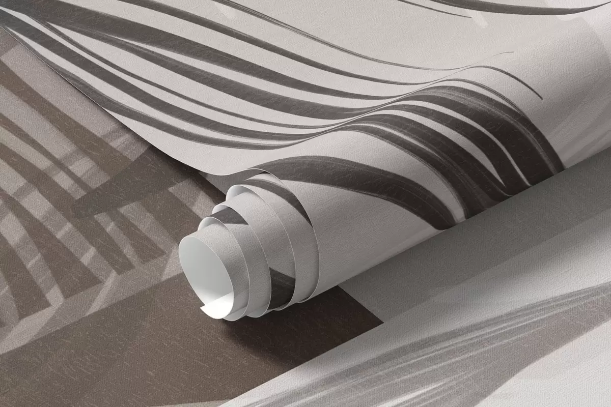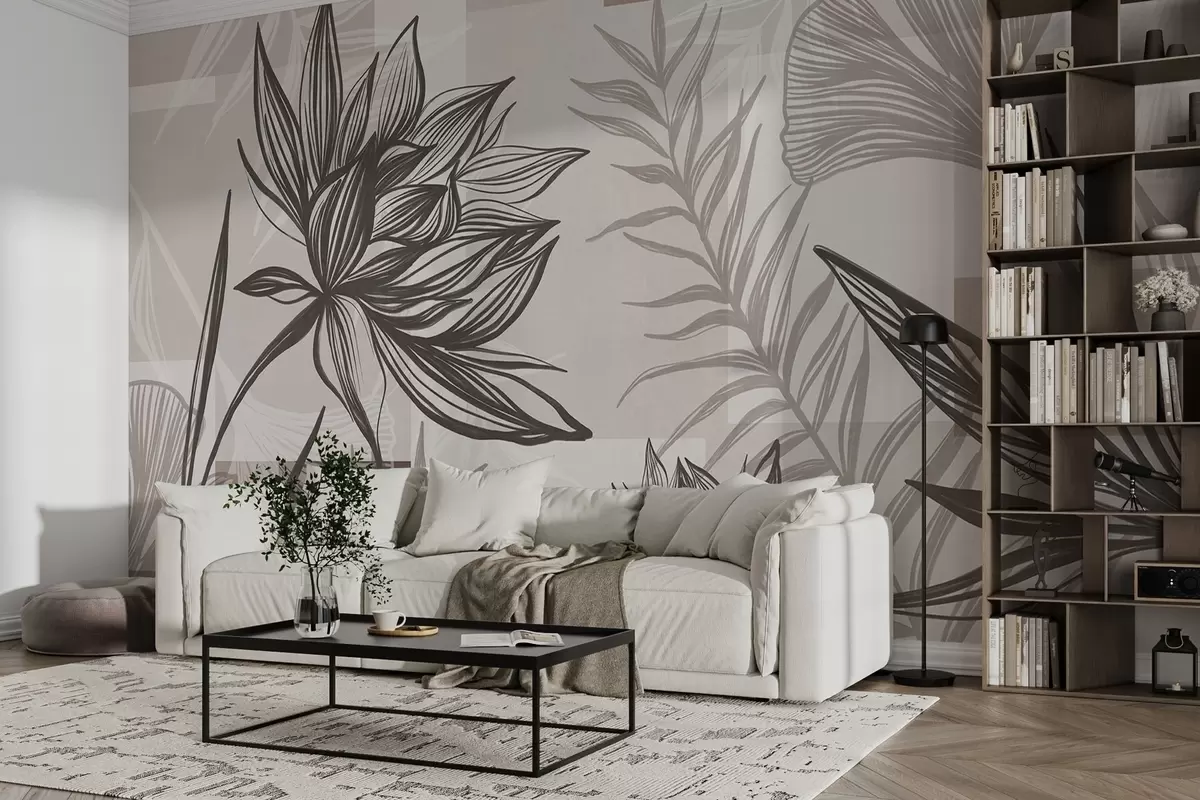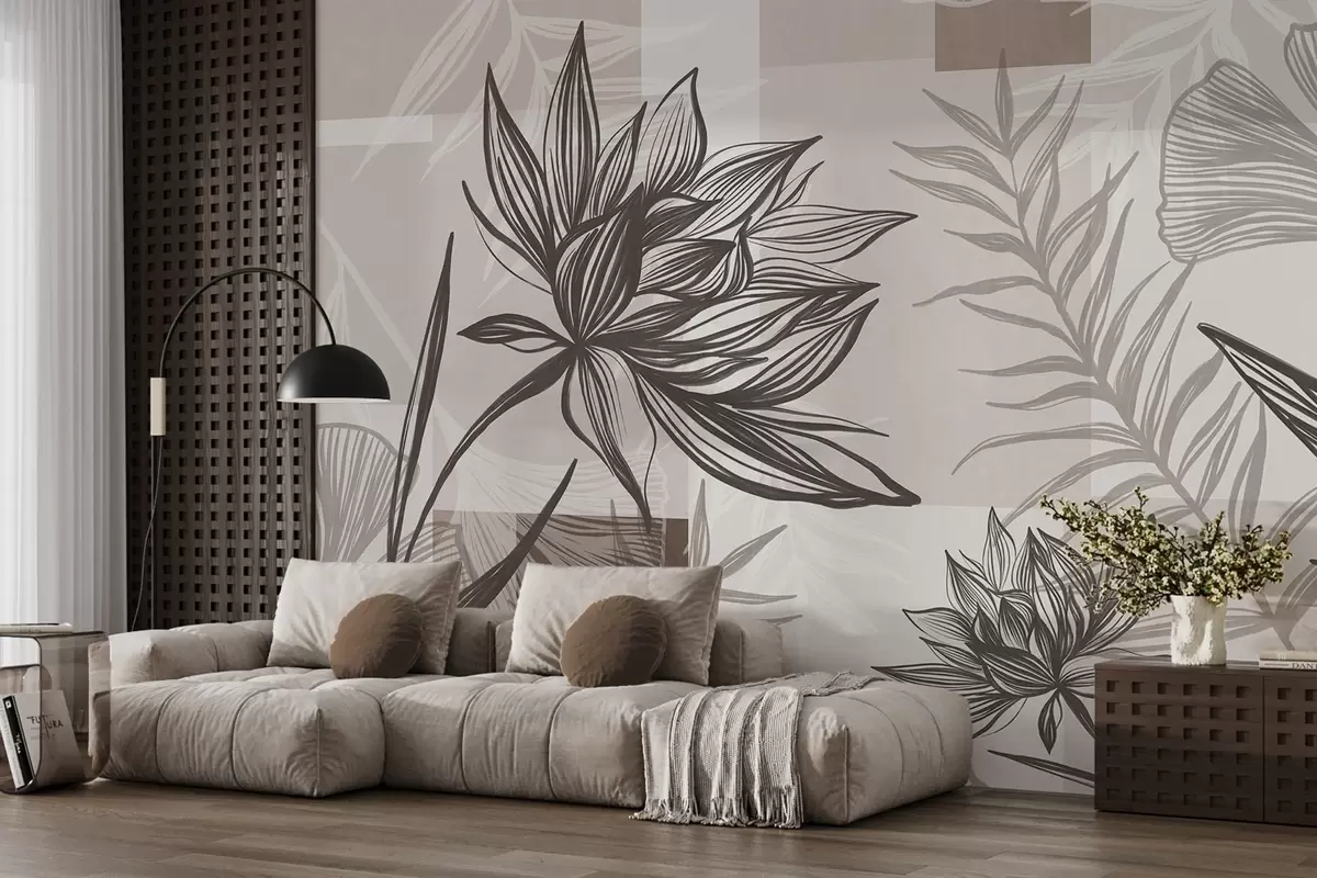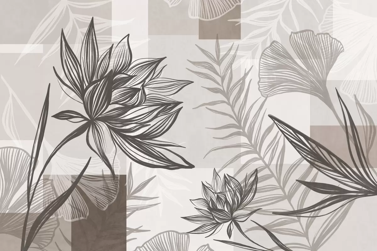 Papel tapiz Flores y hojas estilizadas con textura en tonos marrones y beige, con un fondo geométrico, arte lineal. Nr. w09629