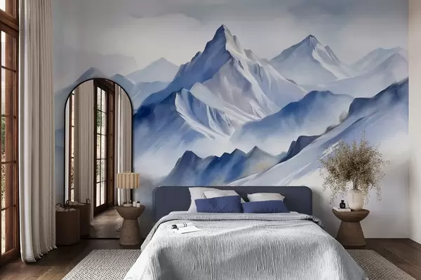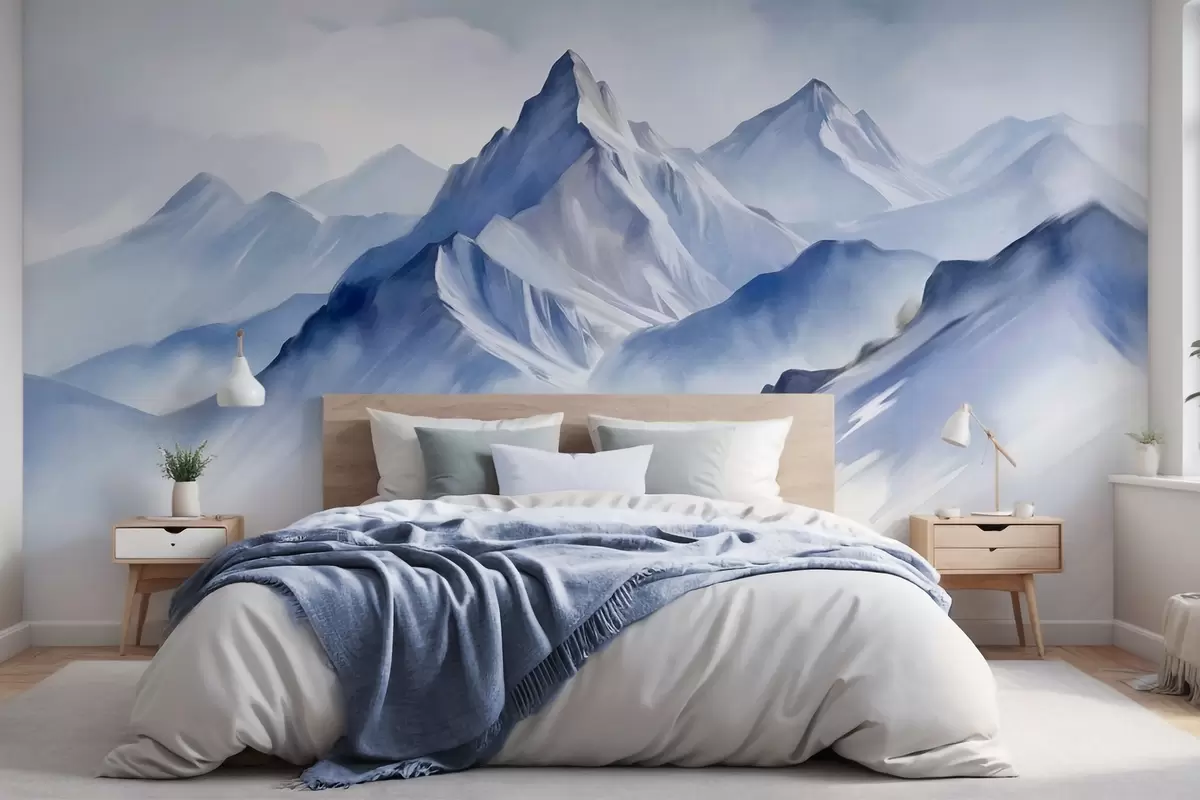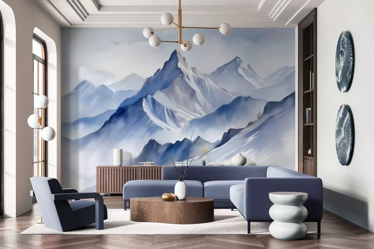 Papel tapiz Montañas nevadas con textura, un suave efecto acuarela y una paleta de colores azul y blanco. Nr. w09630