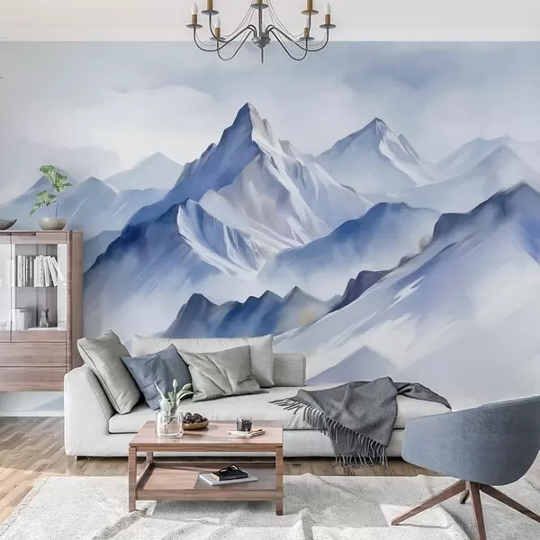 Papel tapiz Montañas nevadas con textura, un suave efecto acuarela y una paleta de colores azul y blanco. Nr. w09630