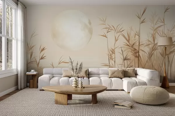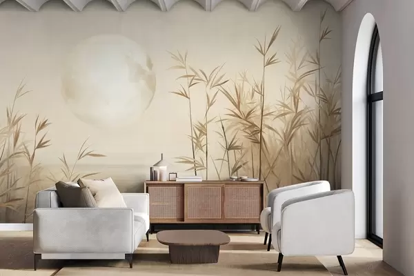 Papel tapiz Paisaje texturizado con altos juncos, lago y luna pálida en un cielo brumoso. Nr. w09631