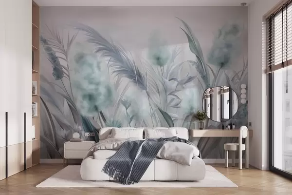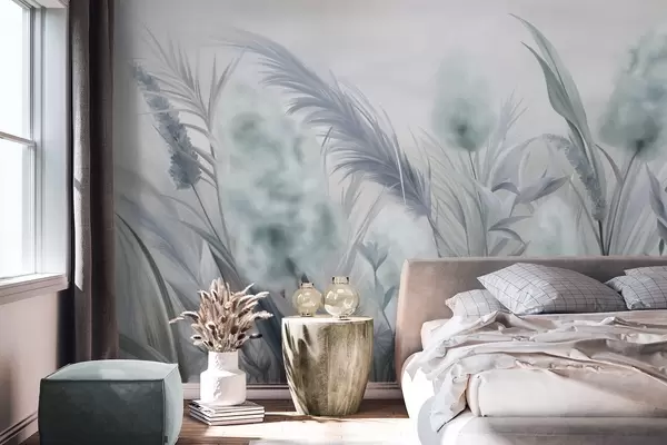 Papel tapiz Hierba de la pampa azul y gris y otras flores secas con un cielo suave y brumoso al fondo. Nr. w09635v1
