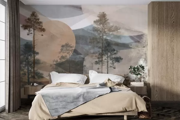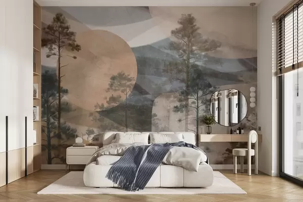Papel tapiz Altos pinos en un paisaje de textura apagada con formas circulares abstractas y montañas en capas en tonos terrosos. Nr. w09636