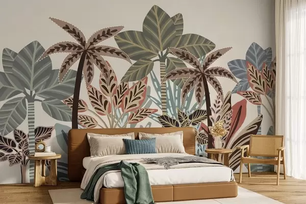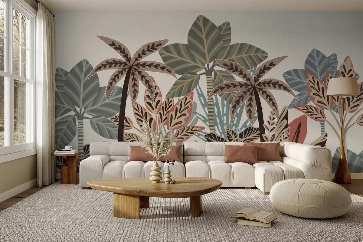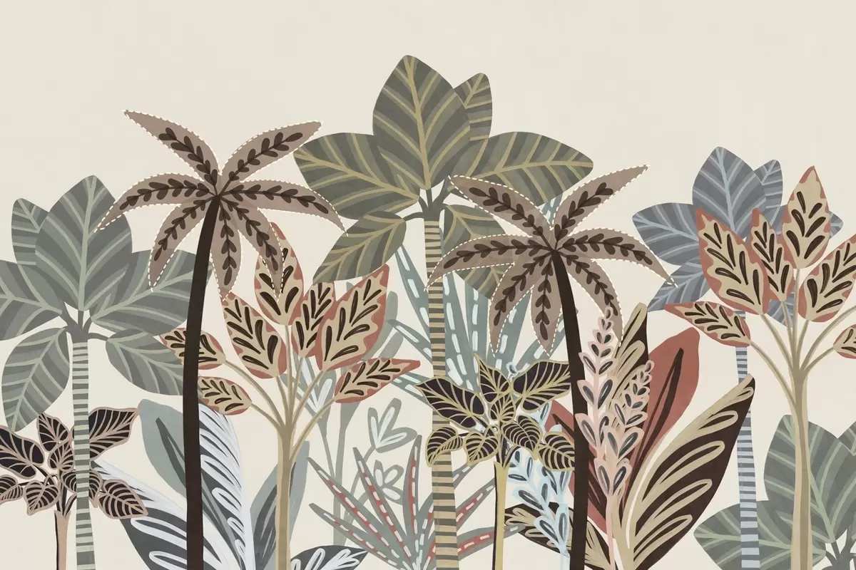 Papel tapiz Plantas tropicales con textura y palmeras con colores apagados en estilo boho decorativo sobre un fondo crema. Nr. w09639