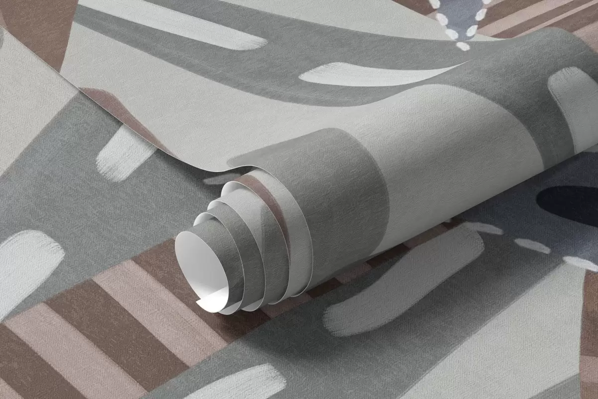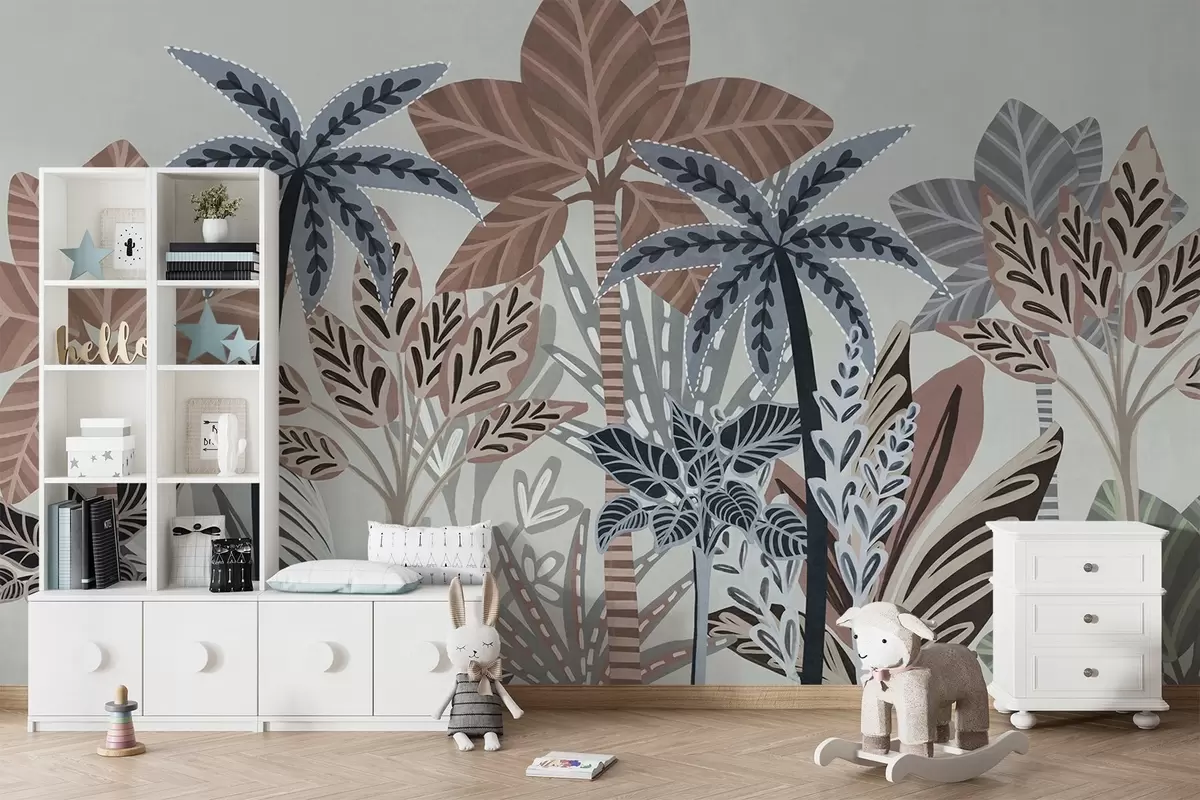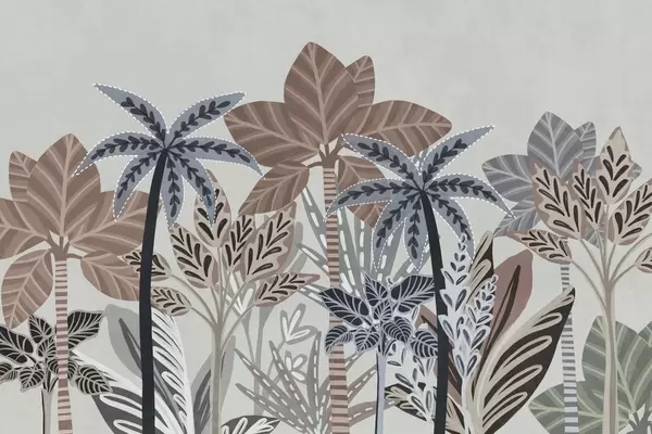 Papel tapiz Plantas tropicales y palmeras con textura y colores apagados en estilo boho decorativo sobre un fondo gris. Nr. w09639v1