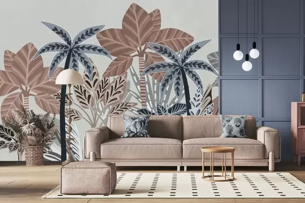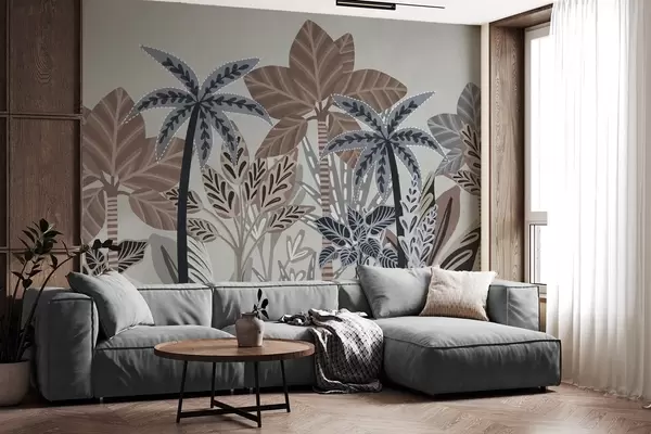 Papel tapiz Plantas tropicales y palmeras con textura y colores apagados en estilo boho decorativo sobre un fondo gris. Nr. w09639v1