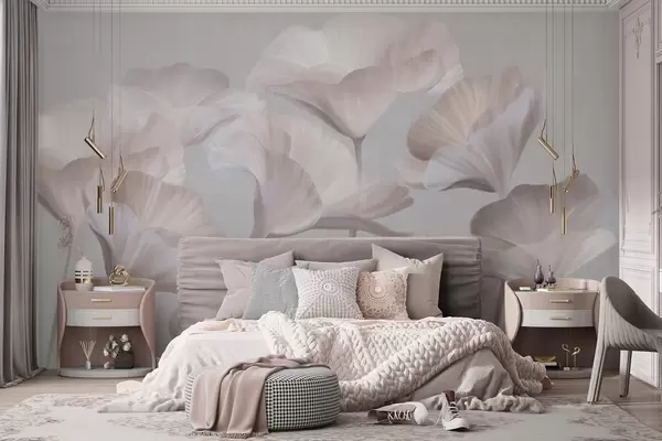 Papel tapiz Flores de loto translúcidas con textura de melocotón pálido y delicados pétalos sobre un fondo gris apagado. Nr. w09640