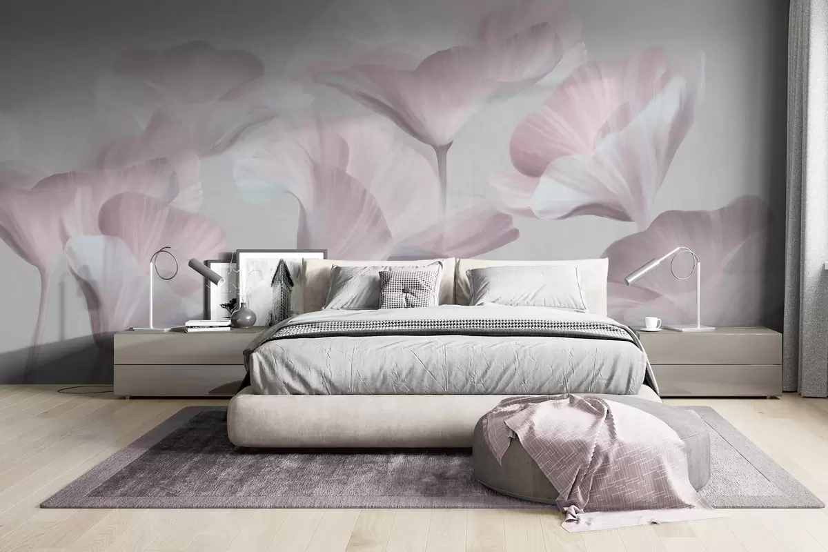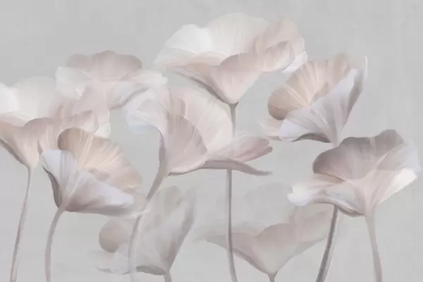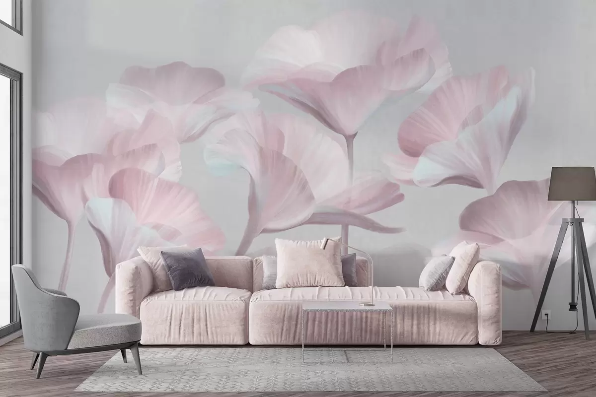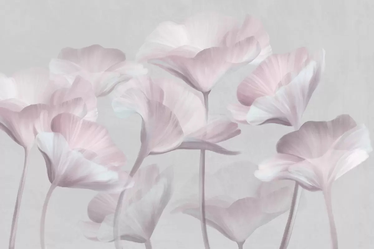 Papel tapiz Flores de loto translúcidas de color rosa pálido con pétalos delicados sobre un fondo gris apagado. Nr. w09640v1