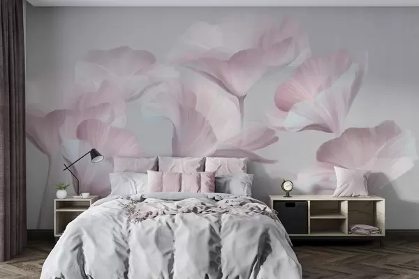 Papel tapiz Flores de loto translúcidas de color rosa pálido con pétalos delicados sobre un fondo gris apagado. Nr. w09640v1