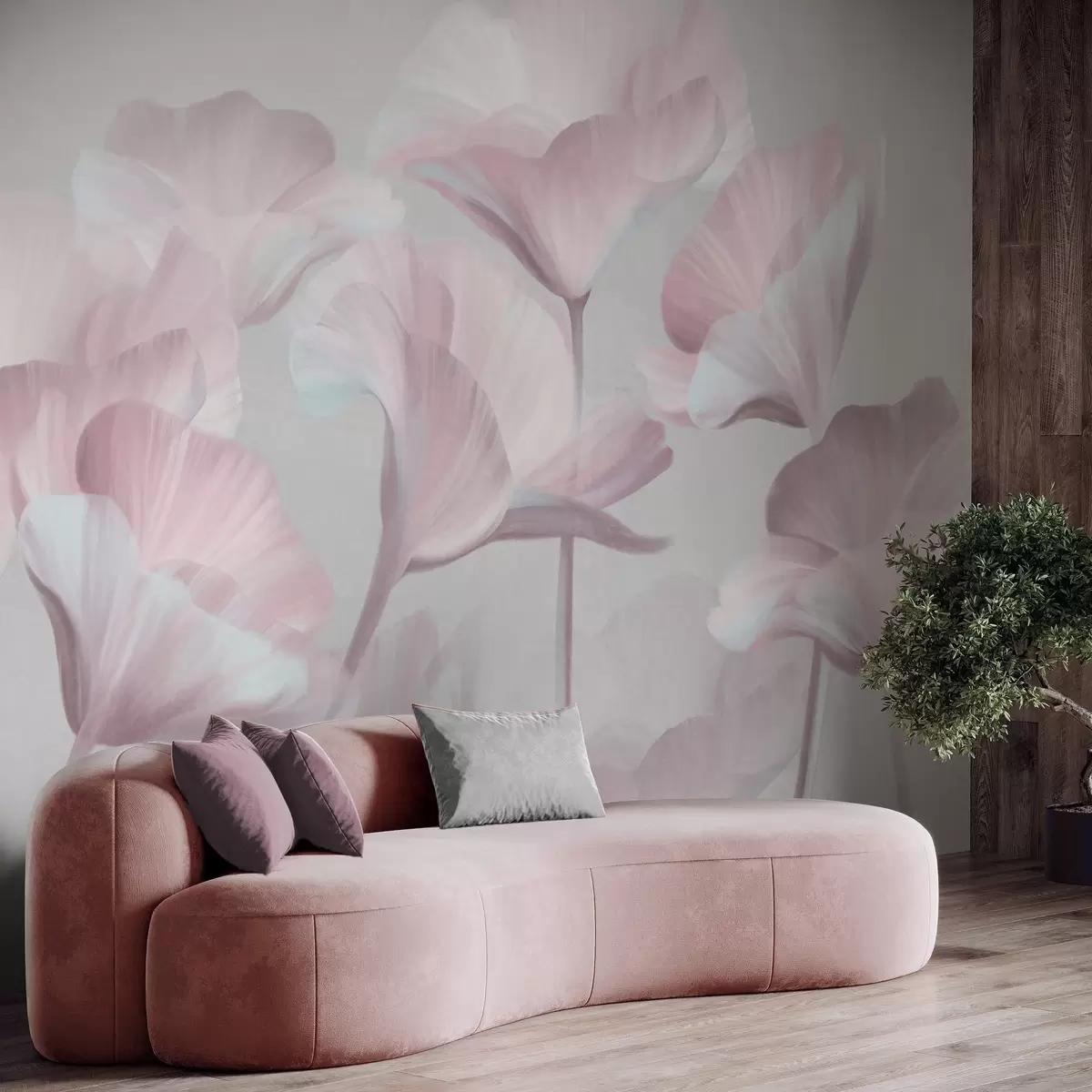 Papel tapiz Flores de loto translúcidas de color rosa pálido con pétalos delicados sobre un fondo gris apagado. Nr. w09640v1