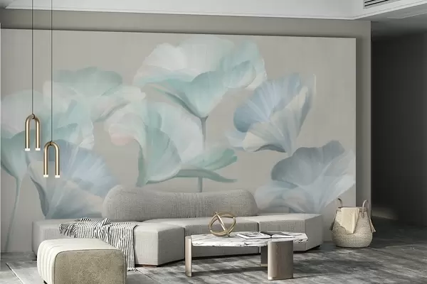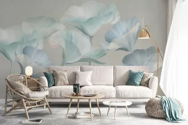 Papel tapiz Flores de loto translúcidas de color turquesa pálido con pétalos delicados sobre un fondo gris apagado. Nr. w09640v2