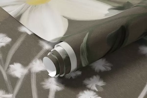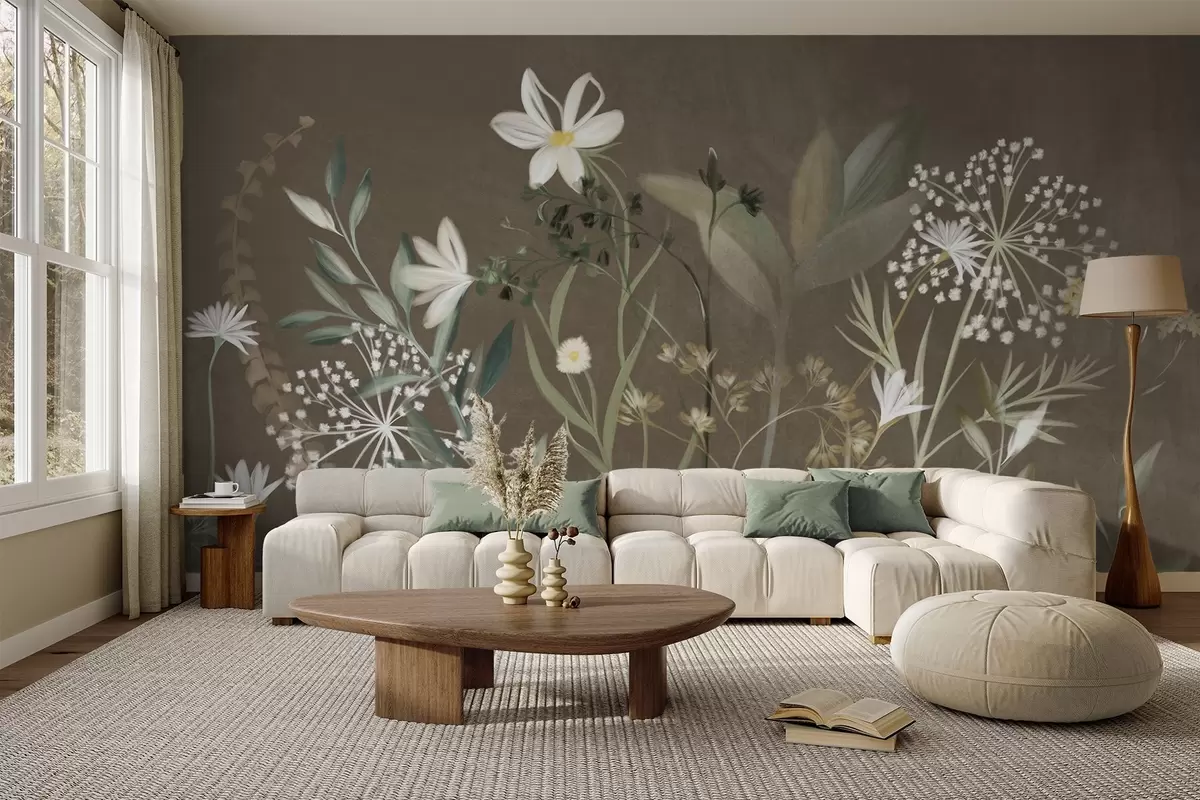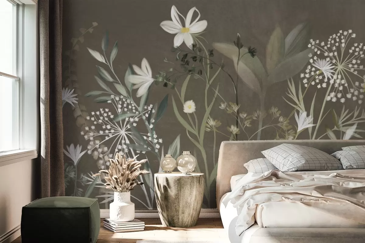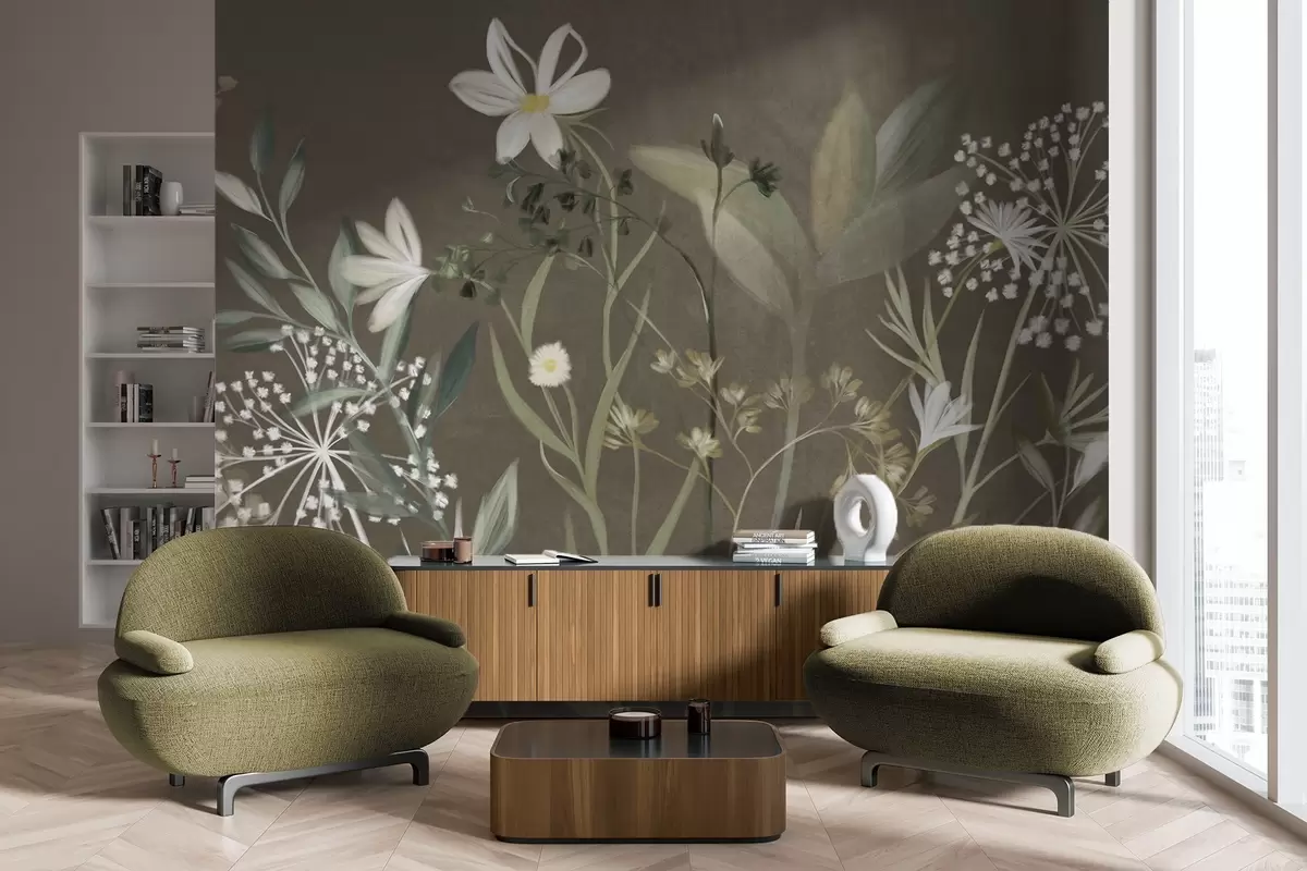 Papel tapiz Delicadas flores silvestres y follaje con textura en tonos verdes y crema apagados sobre un fondo marrón. Nr. w09641v1