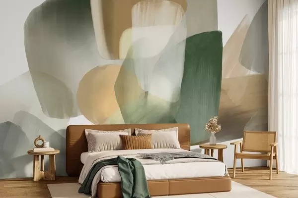 Papel tapiz Formas abstractas con textura en colores verde y beige apagados, con bordes suaves y capas superpuestas. Nr. w09642