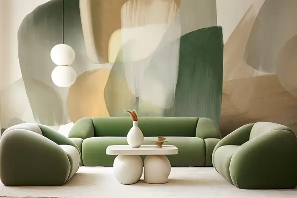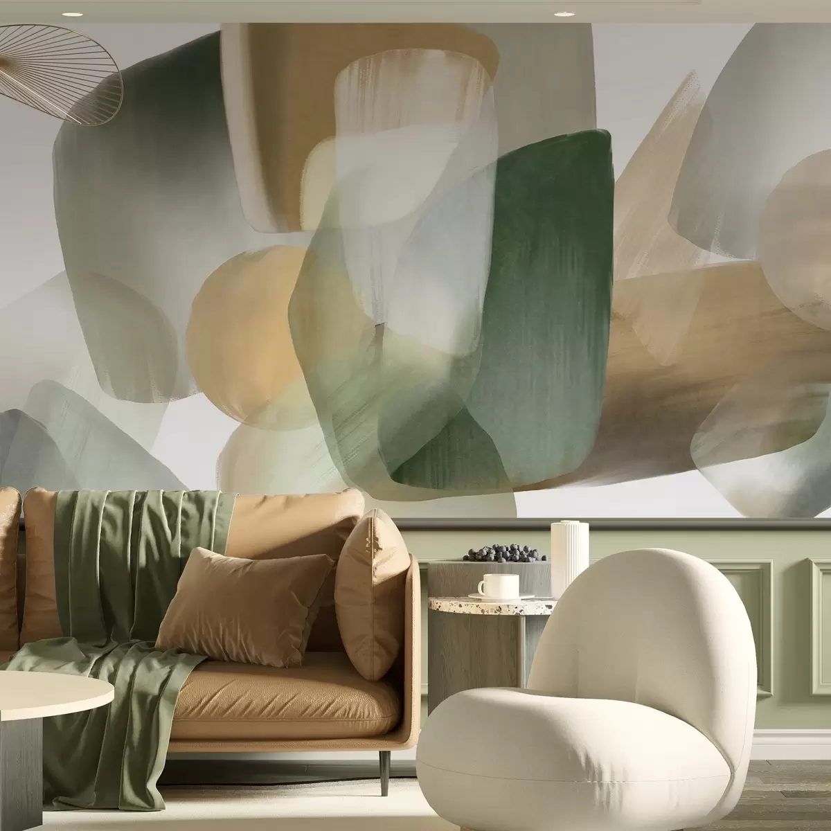Papel tapiz Formas abstractas con textura en colores verde y beige apagados, con bordes suaves y capas superpuestas. Nr. w09642