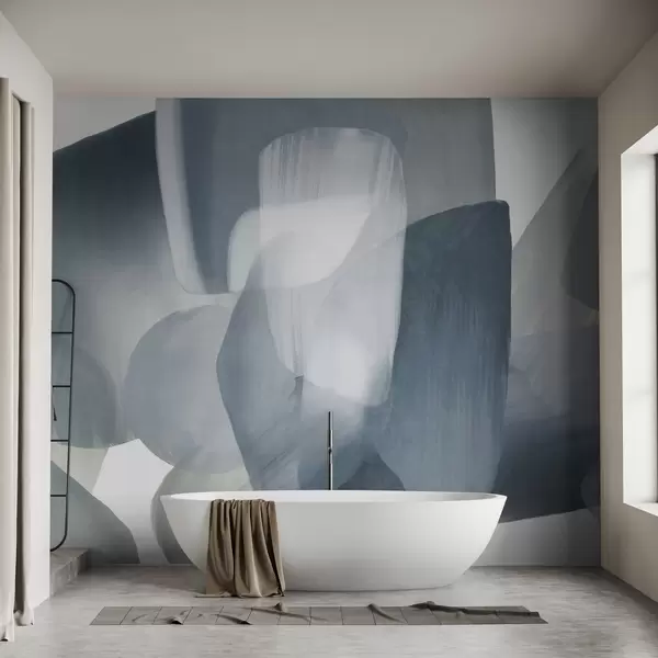 Papel tapiz Formas abstractas con textura en colores azul y gris apagados, con bordes suaves y capas superpuestas. Nr. w09642v1
