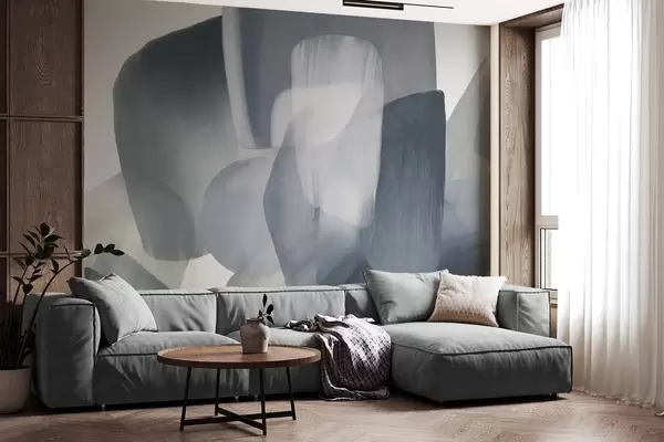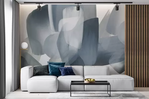 Papel tapiz Formas abstractas con textura en colores azul y gris apagados, con bordes suaves y capas superpuestas. Nr. w09642v1
