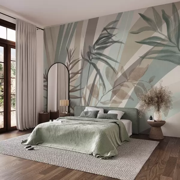 Papel tapiz Hierba alta con textura y hojas en tonos tierra apagados, con líneas abstractas en el fondo, creando un estampado orgánico. Nr. w09643