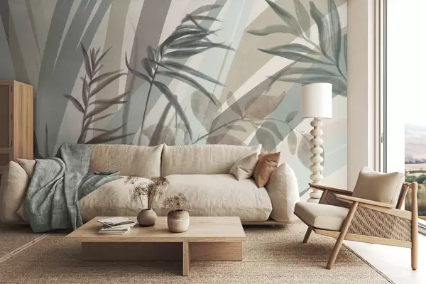 Papel tapiz Hierba alta con textura y hojas en tonos tierra apagados, con líneas abstractas en el fondo, creando un estampado orgánico. Nr. w09643