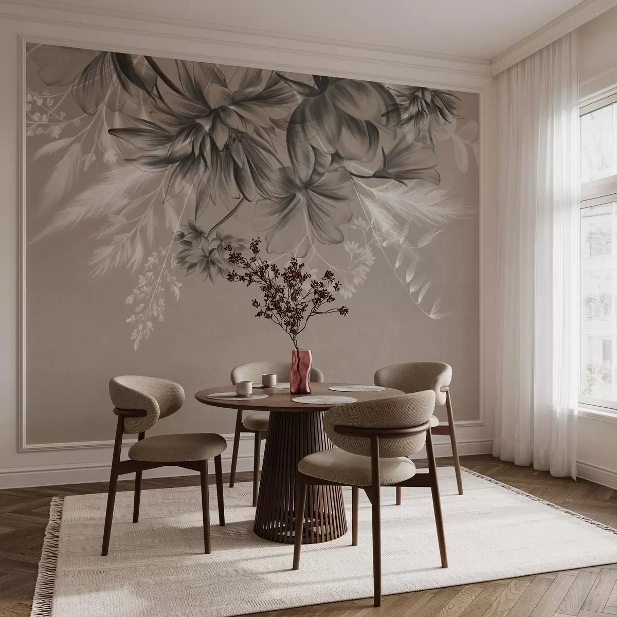 Papel tapiz Flores y helechos texturizados en tonos gris oscuro y blanco sobre un fondo beige apagado, estilo de dibujo. Nr. w09644