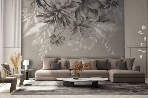 Papel tapiz Flores y helechos texturizados en tonos gris oscuro y blanco sobre un fondo beige apagado, estilo de dibujo. Nr. w09644