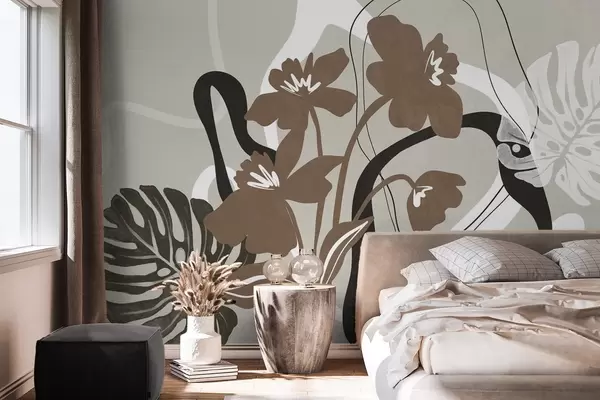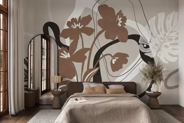 Papel tapiz Flores marrones abstractas con textura y formas blancas y negras sobre fondo beige, arte minimalista. Nr. w09645v1