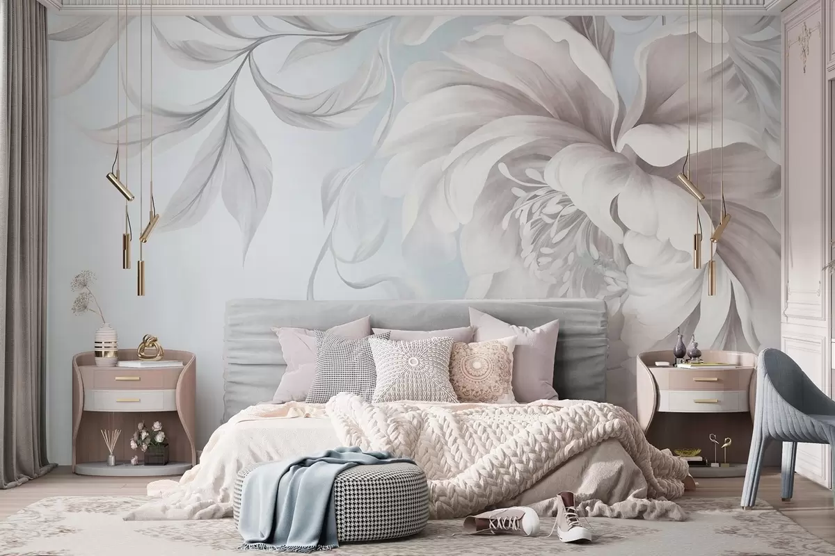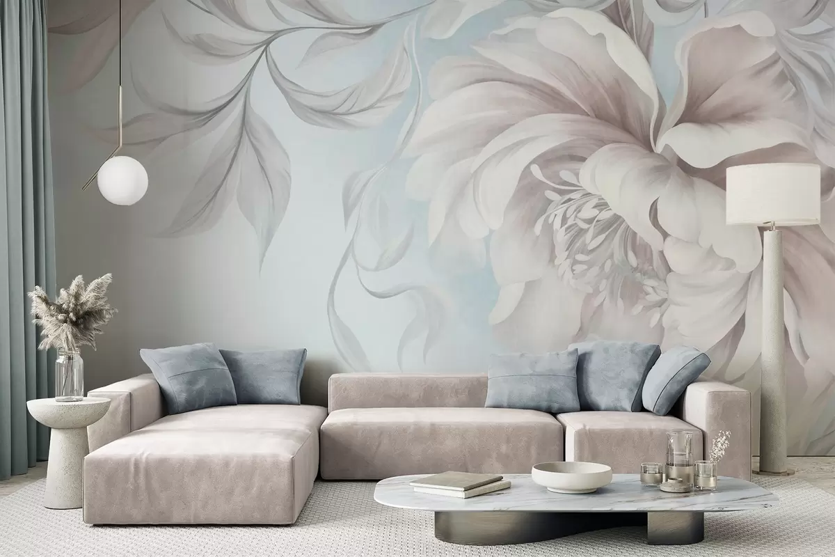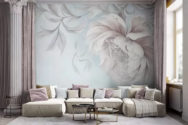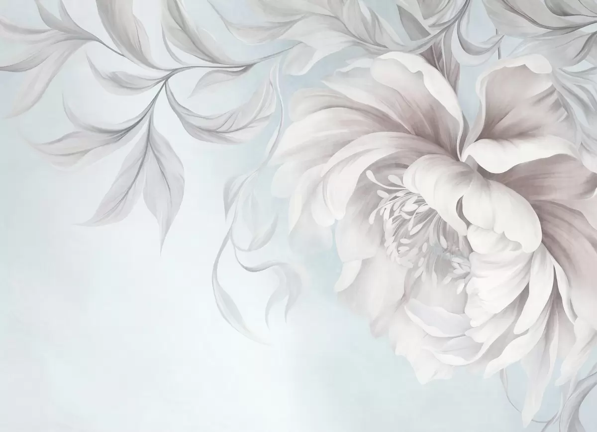 Papel tapiz Peonía grande y con relieve, de pétalos delicados y hojas grises, pintada con un estilo suave Nr. w09647v1
