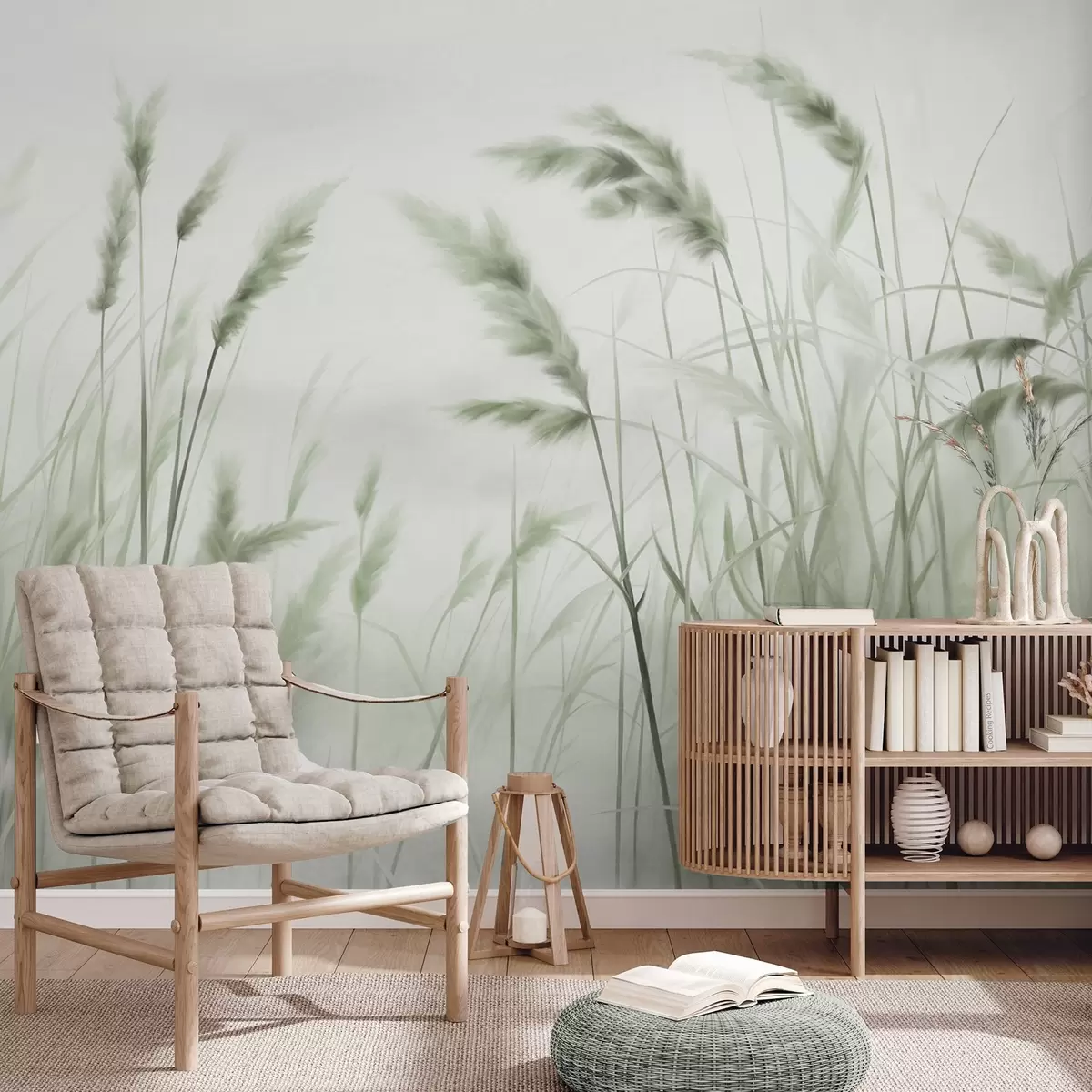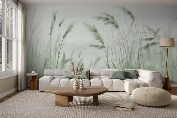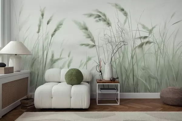 Papel tapiz Hierba seca alta y texturizada con espigas de trigo en el campo sobre un fondo suave y pálido. Nr. w09648v1