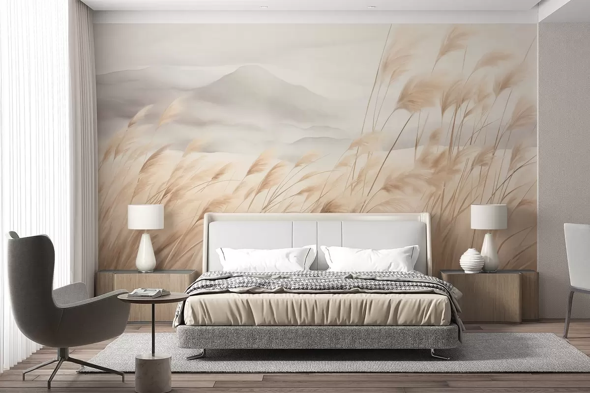 Papel tapiz Paisaje montañoso con textura, con hierba alta y seca bajo un cielo brumoso. Nr. w09649