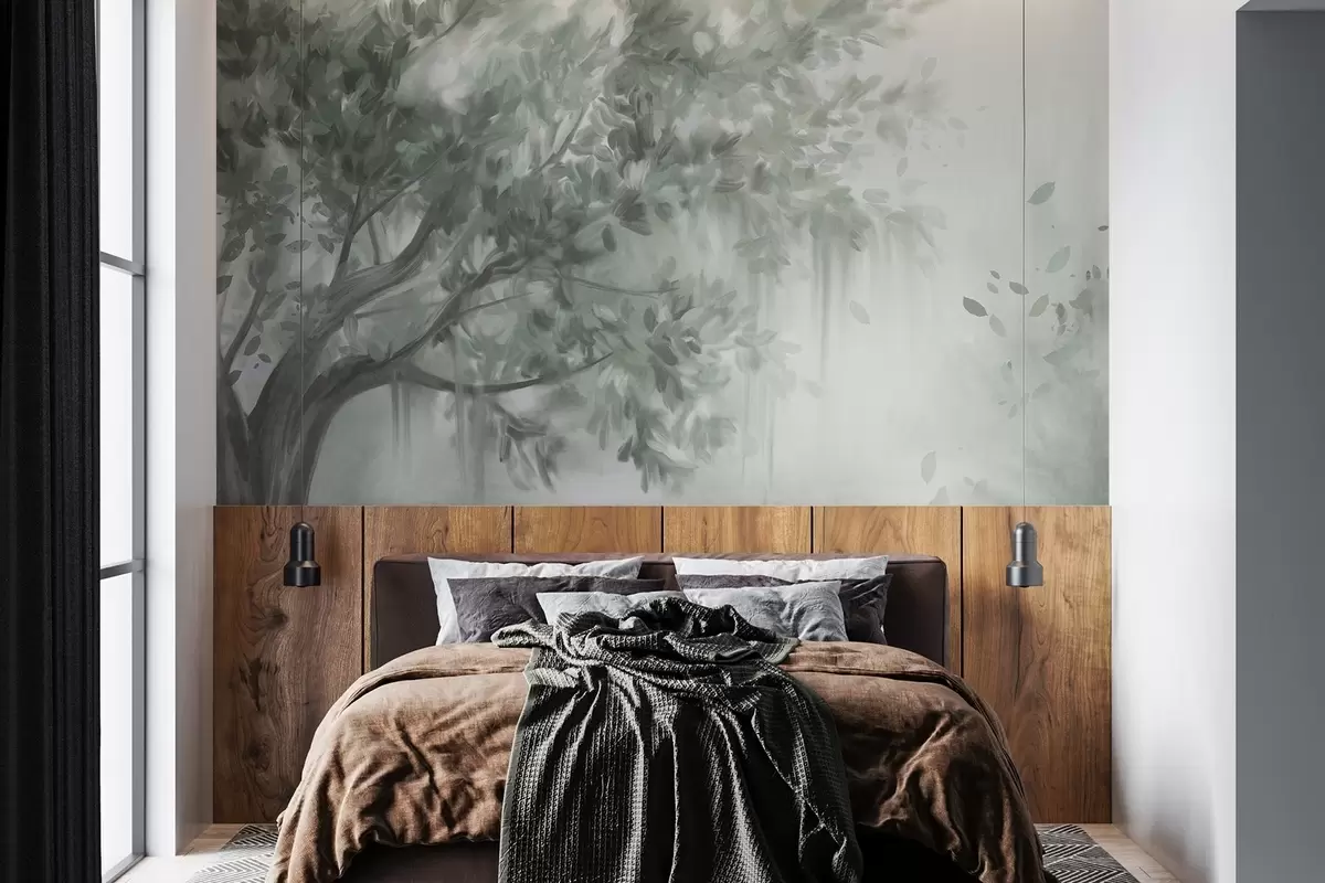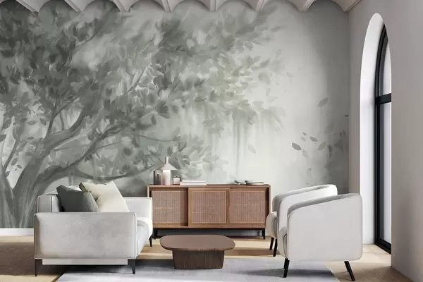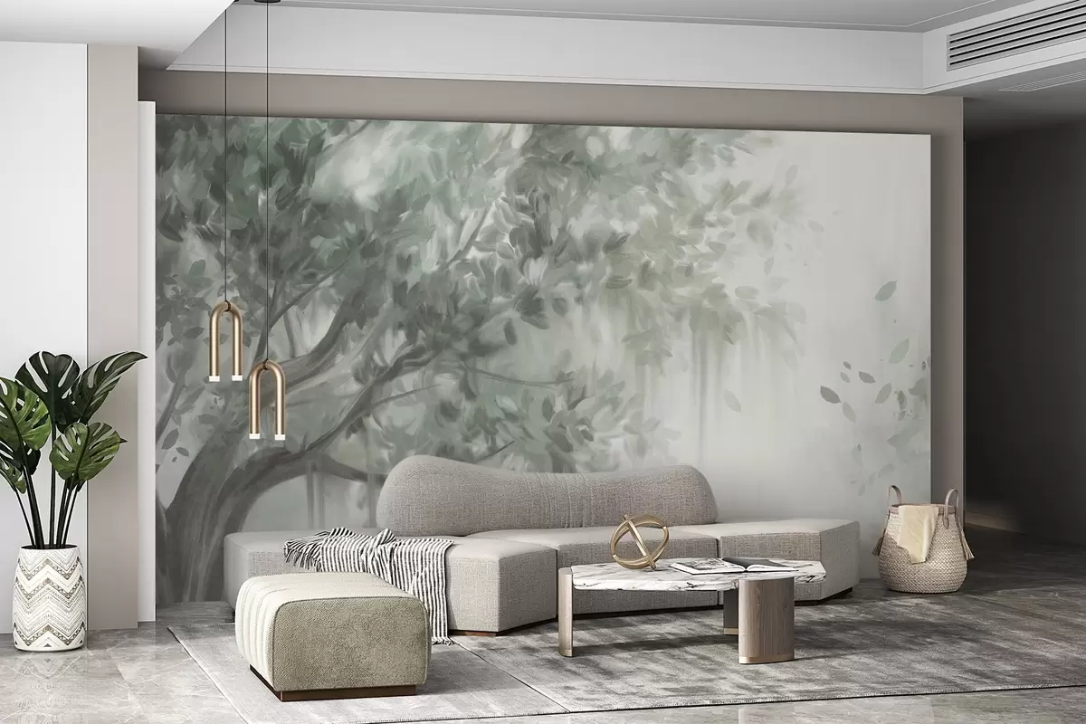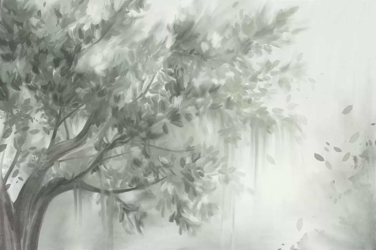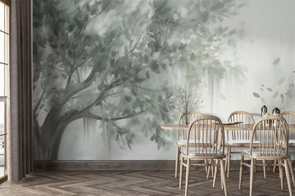 Papel tapiz Árbol texturizado con hojas y ramas verdes, con un fondo suave y difuminado. Nr. w09650v1