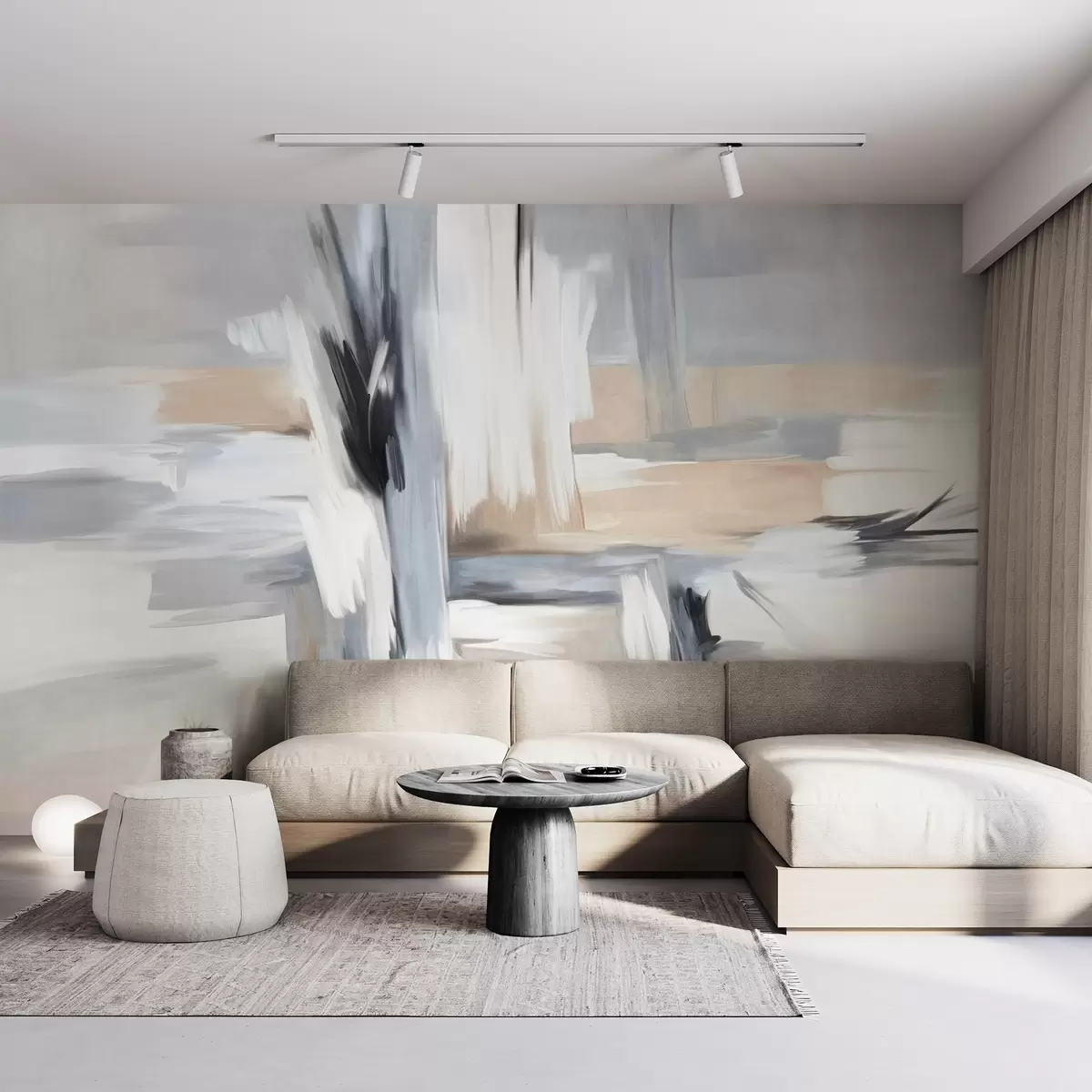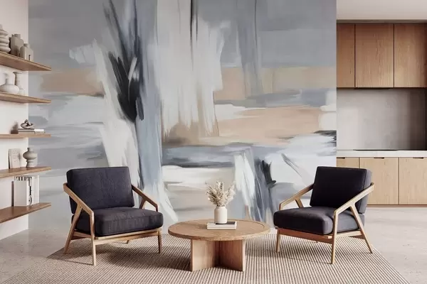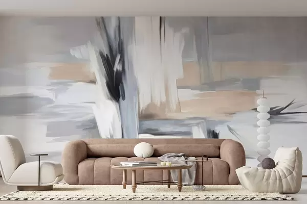 Papel tapiz Estilo pictórico abstracto con textura y pinceladas en tonos blancos, grises y beiges. Nr. w09651