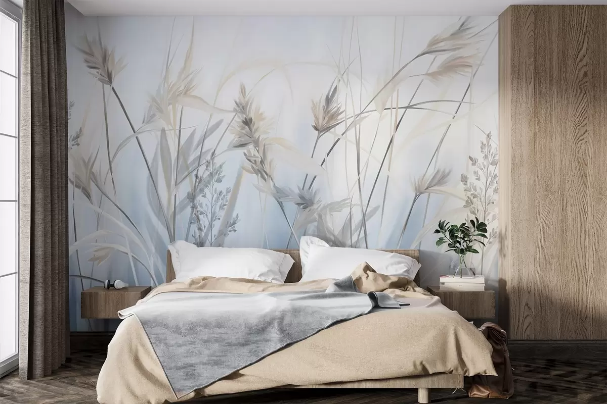 Papel tapiz Tallos altos y secos de hierba con puntas plumosas en tonos apagados, fondo azul y blanco suave y difuminado. Nr. w09652