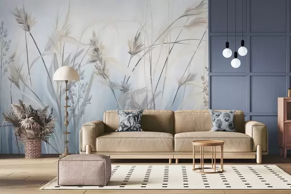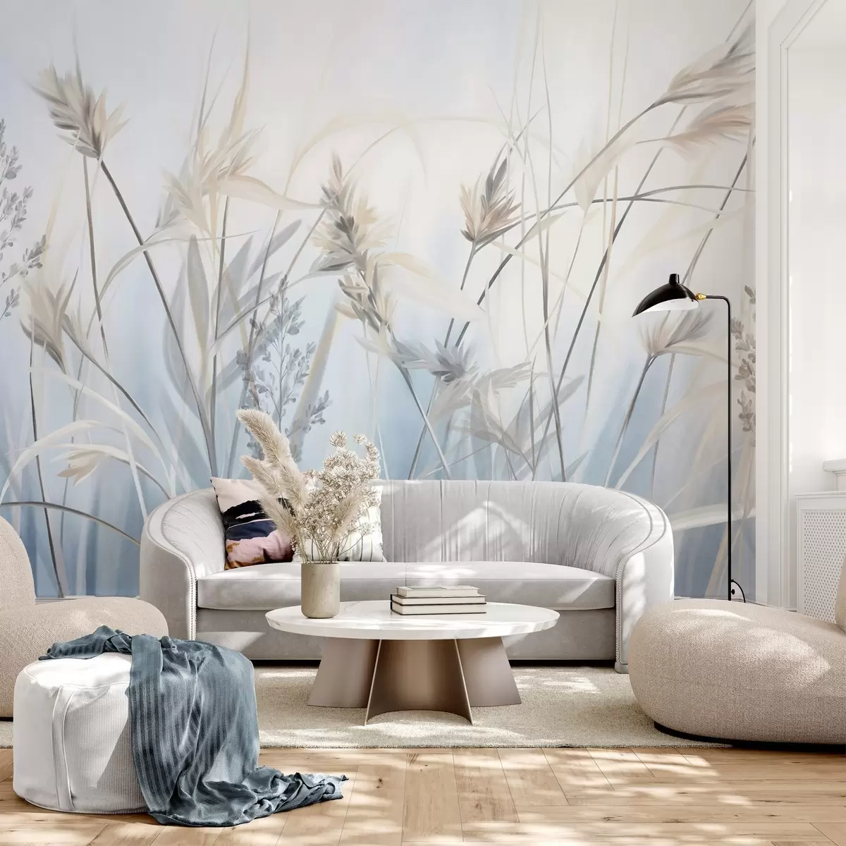Papel tapiz Tallos altos y secos de hierba con puntas plumosas en tonos apagados, fondo azul y blanco suave y difuminado. Nr. w09652