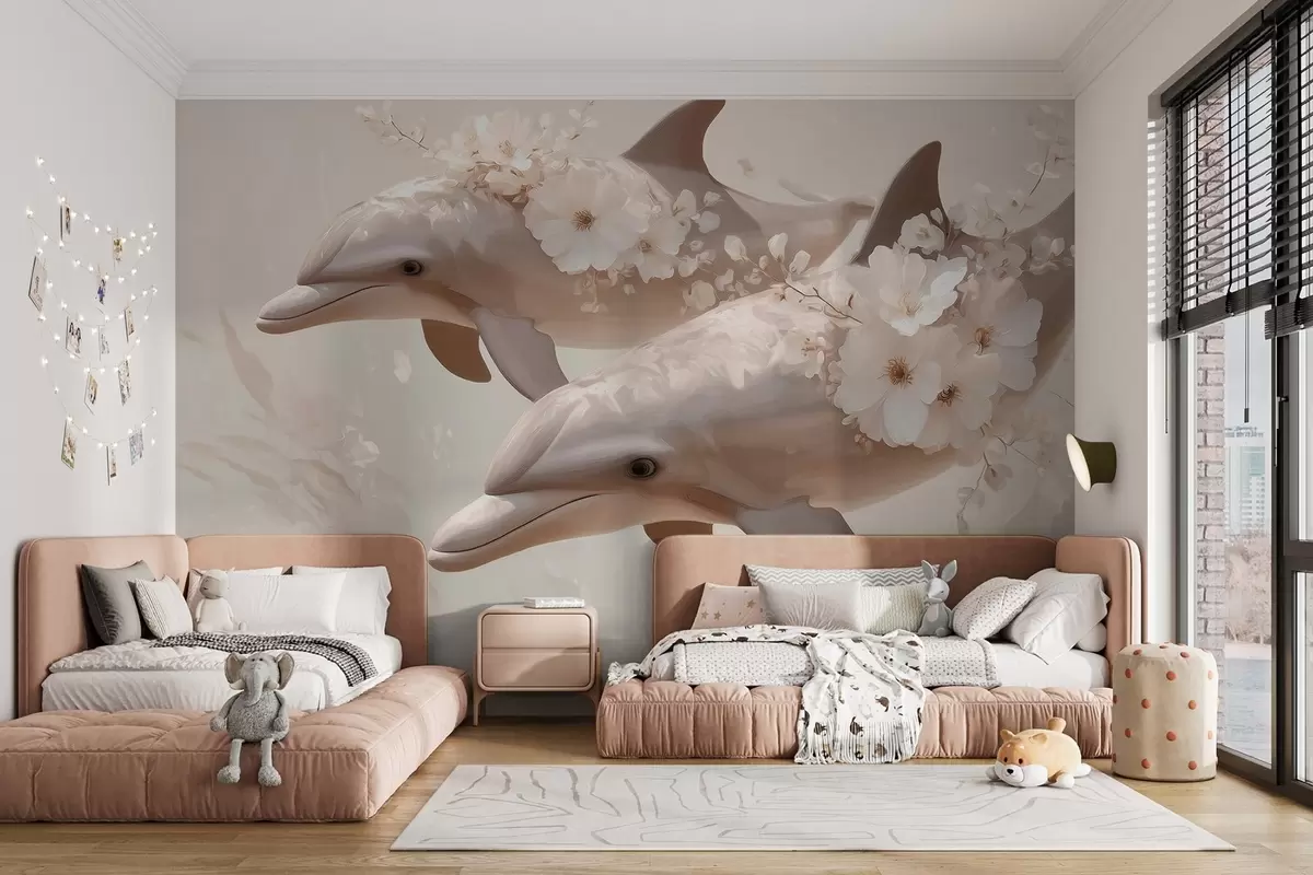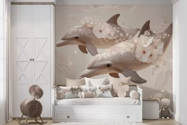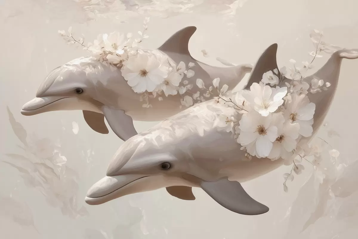 Papel tapiz Delfines en un océano de flores delicadas y luz tenue Nr. w09666