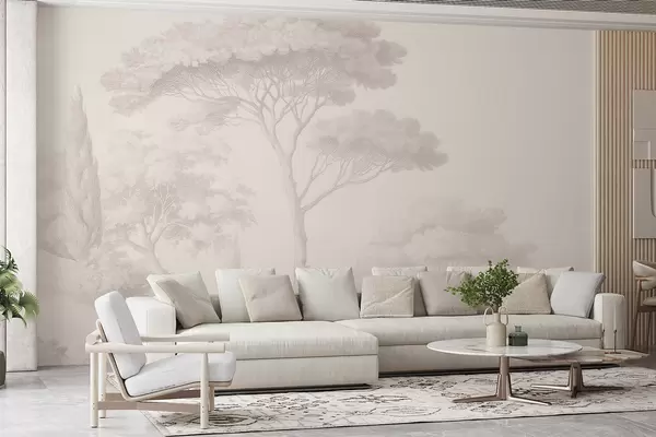 Papel tapiz Tranquilo paisaje forestal en una paleta de colores beige. Nr. w09685