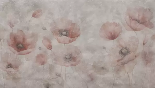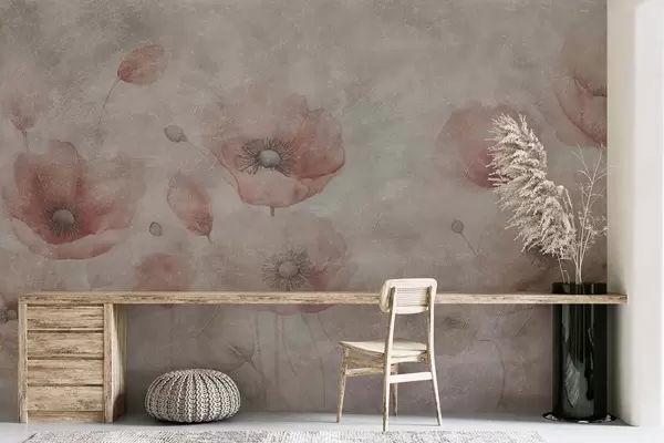 Papel tapiz Grandes flores de amapola en una pared con efecto antiguo. Nr. w09686
