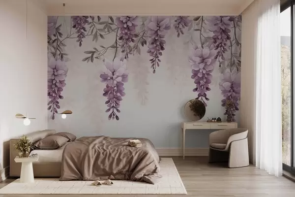 Papel tapiz Delicadas ramas grandes de lavanda colgadas en la pared, imitación acuarela. Nr. w09690